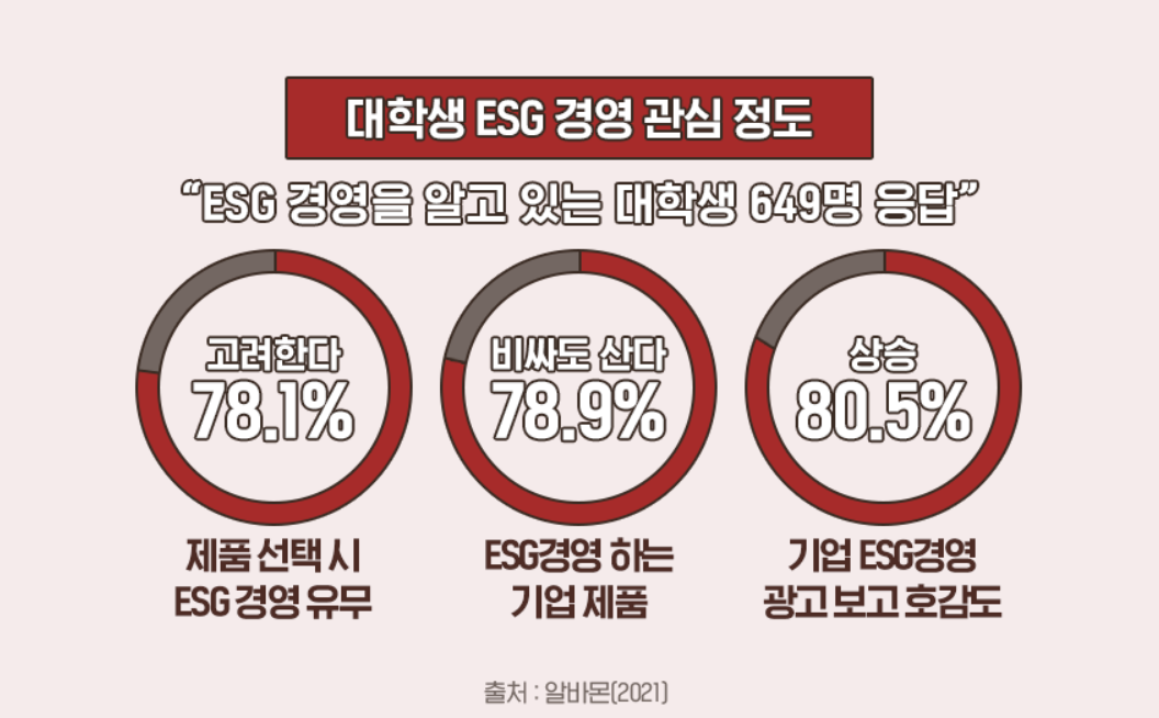 특히 MZ세대는 ‘수박 겉핥기’식의 ESG 경영이 아닌 실질적인 ESG 경영을 실천하기를 원하고 있는데요. 예를 들어 제조 과정이 친환경적이지 않아 오히려 환경오염을 유발하지만 친환경적으로 포장하는 ‘그린 워싱’에 대해 비판적인 인식이 확산되고 있습니다. 또, 근로자를 안전하지 않은 환경에서 근무하도록 하면서 ‘사회적 책임을 다하는 기업’이라고 마케팅을 벌이는 ‘위선’을 지적하기도 하는데요. 단지 일시적인 친환경 이벤트나 홍보만 하는 것이 아니라 지속적으로 사회에 선한 영향력을 발휘하는 것이 곧 MZ세대가 원하는 ESG 경영인 셈입니다.