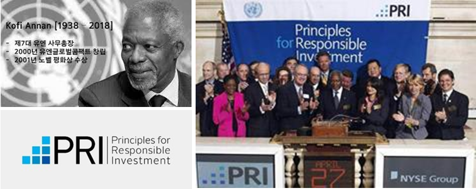 ▶ 기업의 사회적 책임 투자 (PRI)에 대한 첫 걸음은 '코피 아난 (Kofi Annan)' 전 유엔 사무총장에 의해 주도 (2006)