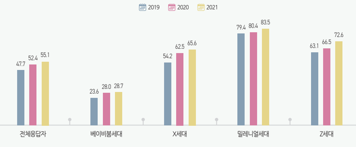 세대별로는 2021년 기준 밀레니얼세대가 83.5%로 가장 높은 이용률을 보였고, 다음으로 Z세대(72.6%), X세대(65.6%), 베이비붐세대(28.7%)의 순으로 나타났다.