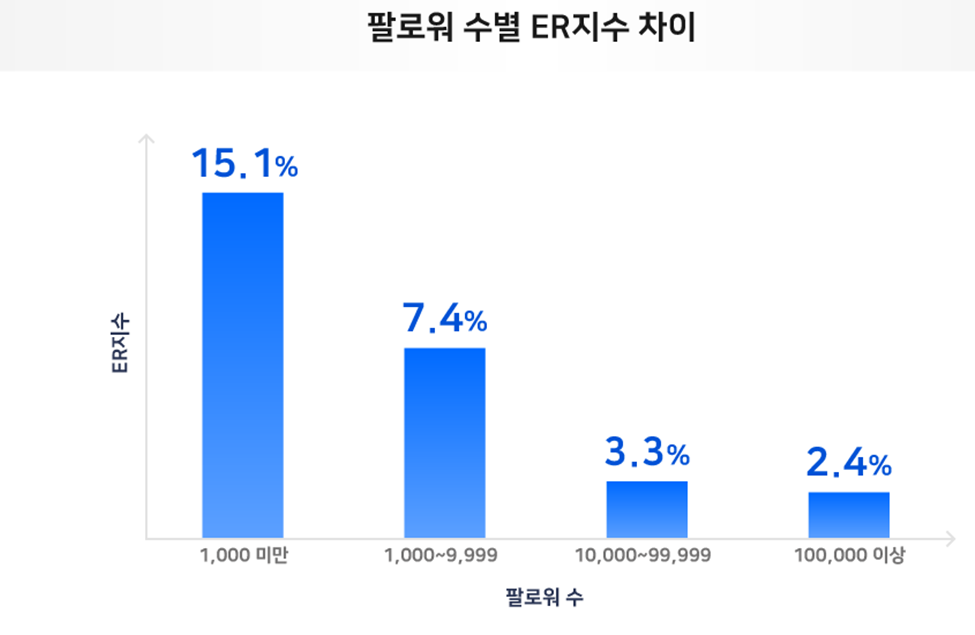 인플루언서를 필요로 하는 기업들도 이제는 스마트 해지고 있다과거 메가 인플루언서에 의존하여 정보를 확산하는데 급급했다면 이제는 저비용, 고효율을 따지기 시작하였으며마케팅 효과를 진단 및 판단할 수 있는 솔루션과 지표들을 마련하기 시작하였다현재 기업은 적합한 홍보 파트너로서 인플루언서를 찾을 때 크게 두 가지를 고려하고 있다양적인 ‘도달(reach)’과 질적인 ‘임팩트(impact)’ 이다양적인 관점에서 인플루언서를 분류할 때는 팔로워 수가 중요한 기준이 된다많은 팔로워를 거느릴수록 양적인 관점에서 메시지가 미치는 도달 범위는 더 넓어진다하지만 팔로워가 많아질수록 인플루언서와 팔로워 간 관계가 느슨해지고 관여도가 낮아진다는 단점은 있다질적인 관점에서 인플루언서의 파워를 가늠하는 중요한 잣대는 영향력이다전문성과 친밀도, 연계율이 높을 수록 마케팅 효과가 좋다는 것이 이미 입증되고 있다이와 같이 최근 각종 브랜드에서 가장 니즈가 많은 그룹이 나노와 마이크로 인플루언서  현상은 ER지수(*팔로워가 라이크, 공유, 댓글 등으로 홍보내용에 반응하는 비율)로도 증명되고 있다2022년 미국 광고 전문지 애드위크의 조사에 따르면10만명 이상 팔로워를 보유할 경우 ER지수는 2.4%에 불과했지만 팔로워 1000명 이하의 ER지수는 15.1%로 나타났다.