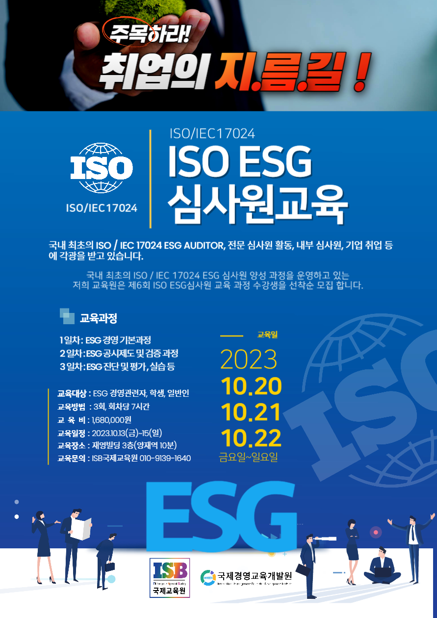 ISB 교육원은 제7회 ISO ESG 심사원 교육 과정 수강생을 선착순 모집합니다.