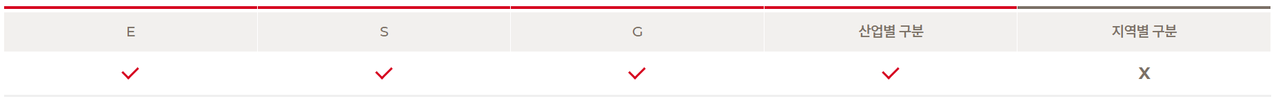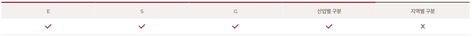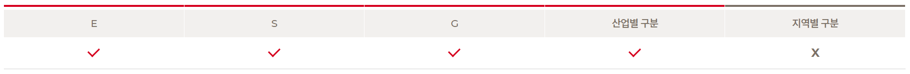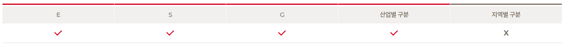 ● 환경: 기후변화(탄소배출, 기후변화 취약성 등), 자연자본(생물다양성, 물 스트레스 등), 오염 및 폐기물, 환경 기회(청정기술 기회, 재생에너지 등)