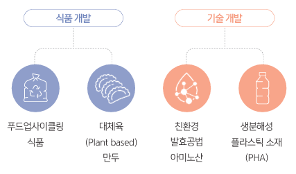 폐기 부산물을 활용한 푸드업사이클링 식품, 대체육 만두 등을 개발하고 확대할 예정이다. 또한 아미노산을 친환경 발효공법으로 생산하여 폐수·폐가스를 줄였으며 생분해성 플라스틱 소재 PHA를 개발하였다.