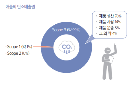 Scope 3에서는 소재 수급, 생산, 포장, 판매, 폐기의 전 과정에서 발생하는 것을 부문적으로 살펴봐야 하며, 특히 공급망 관리가 매우 중요하다. 예를 들어 애플의 경우 사업장 내 직·간접 배출은 약 1% 정도에 불과하다. 하지 만 협력 부품업체 생산과정, 판매 및 사용과정의 탄소배출까지 포함한다면 Scope 3 배출량은 나머지 99%에 이르는 큰 비중을 차지한다.