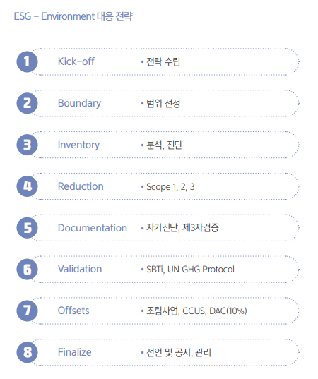 ESG 중 환경부분 대응전략을 수립하기 위해서는 크게 MRV(Monitoring, Reporting and Verification), Reduction, RE100, Offset의 4가지 단계가 필요하다. 그리고 이는 좀더 구체적으로 8가지의 과정으로 구분할 수 있다.