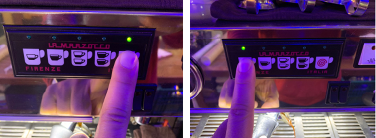 만약 1.3에서 각 추출 버튼마다 다른 물 양을 메모리했다면 보통 리스트레또(20~25ml), 에스프레소(30ml), 리스트레또 더블(40~50ml), 에스프레소 더블(60ml)로 메모리해서 추출한다.