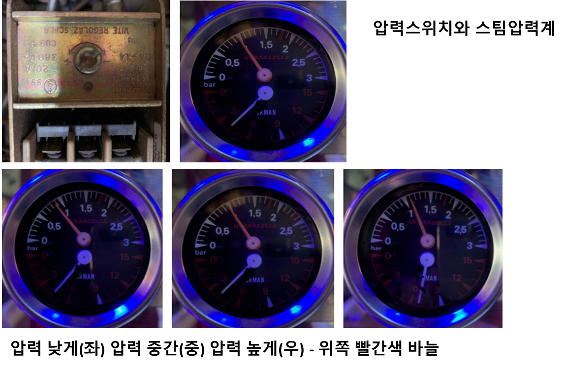 이런 경우라면 추출되는 물의 온도를 직접 측정한다. 또한 압력계를 통해 설정온도를 확인할 수 있으며 보통 0.8~1.2bar 사이를 지시한다.