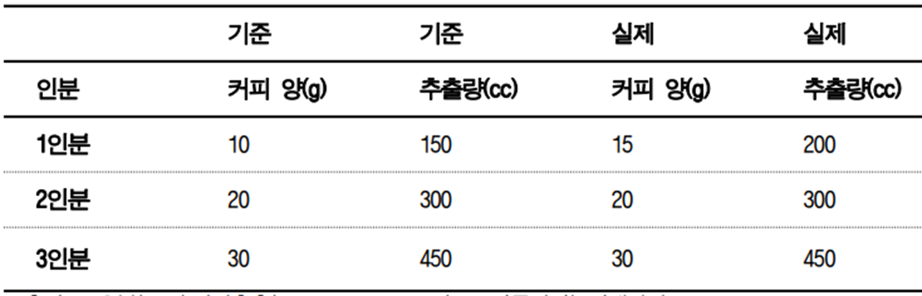 부드럽고 연한 커피가 될 것이다. 사람마다 선호하는 맛이 있기 때문에 자신의 입맛에 맞는 커피를 선택하기 위해서는 여러 번의 다양한 방법의 추출을 해보고 맛보는 것이 중요하다. 다음의 표는 보편적 기준을 제시한 것이다.
