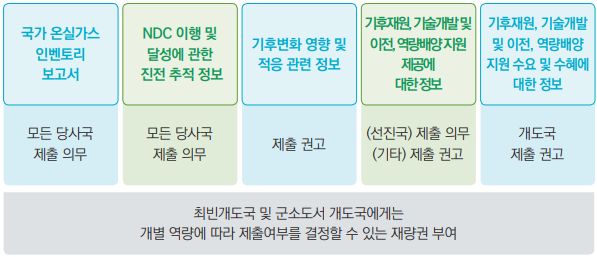 개도국 지원을 위해 제공한 기후재원·기술·역량배양 관련 정보를 선진국은 반드시 제출해야 하고, 지원 제공 의무가 없는 자발적 공여 국가는 이에 대한 제출 여부를 선택할 수 있다. 아울러 협정 제9조제7항에 따라 선진국이 제공한 기후재원 정보도 BTR에 포함하여 제출토록 하였다. 반면 개도국은 지원받은 기후재원·기술·역량배양 관련 정보를 제출하되, 자국 역량 범위 내에서 작성 및 제출할 수 있다.