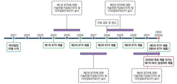 한편 NDC 목표연도가 포함된 BTR 제출 시에는 자국이 NDC를 달성했는지 평가하여 제출해야 한다. 즉 우리나라와 같이 2030년을 목표연도로 하여 NDC를 제출한 국가는 2032년에 제출하는 BTR을 통해 최종 달성여부를 평가하여 제출하게 된다.