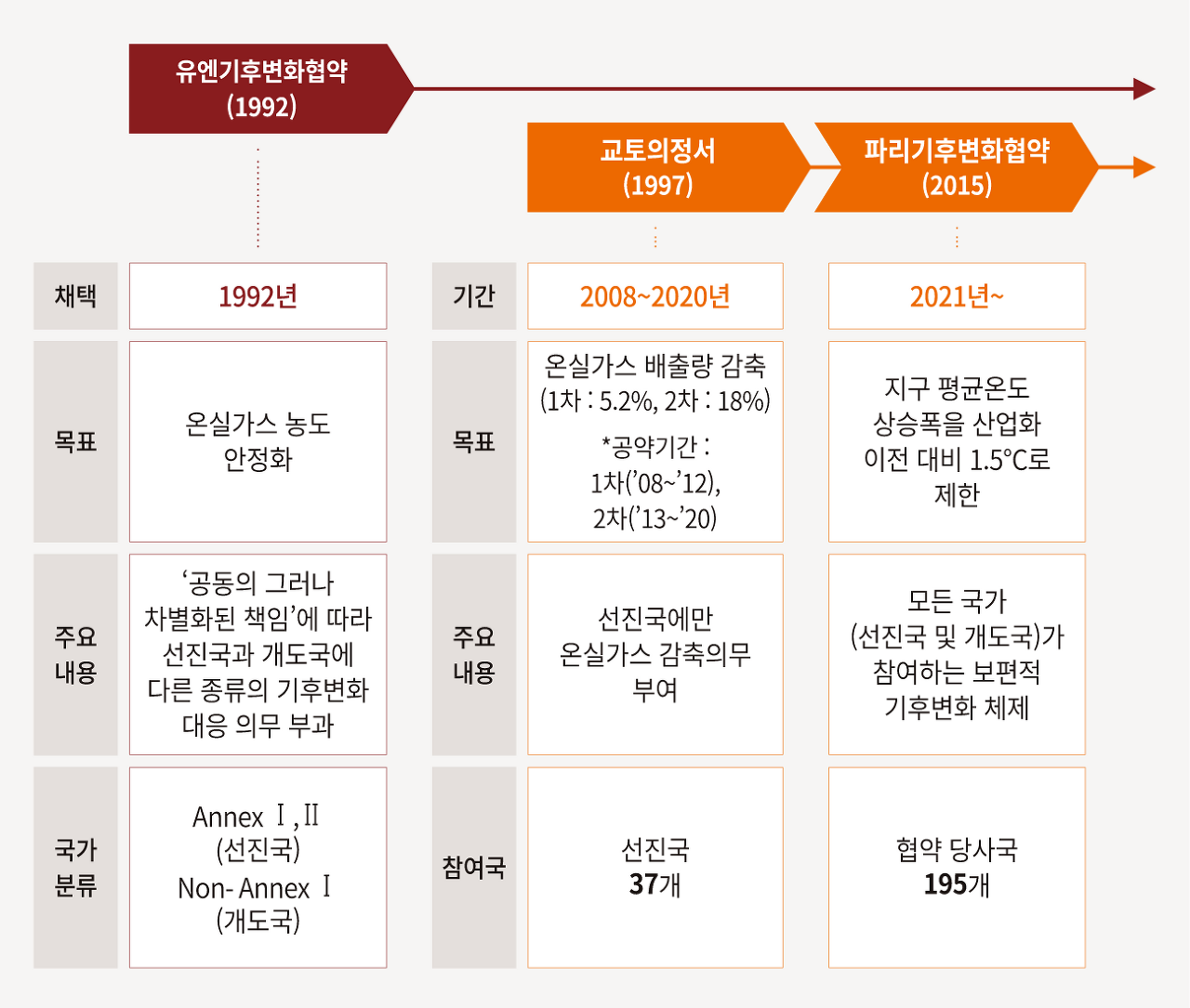 1992년 5월 브라질 리우데자네이루에서 열린 환경회의에서 채택된 협약으로 지구온난화에 따른 이상 기후현상을 예방하는 것을 목표로 한다. 현재 197개국이 비준했다. ▶국가별 온실가스 배출 현황에 대한 국가통계 및 정책 이행에 관한 보고서 작성 ▶온실가스 배출 감축을 위한 정책 수립 및 시행 ▶온실가스 배출량 감축 권고 등이 주요 내용이다. 이후 교토의정서(1997), 파리기후변화협약(2015)이 차례로 채택됐다. 협약 당사국은 매년 당사국총회(COP)를 개최한다. 2021년 11월 영국에서 제26차 유엔기후변화협약 당사국총회(COP26)가 예정돼 있다.
