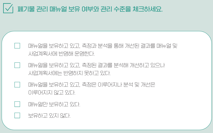 폐기물 및 재활용 관리 매뉴얼을 개발하여 배출량을 지속적으로 관리합니다. 정부 등 외부 기관의 평가 기준이 되는 자료이므로 신중하게 제작합니다.