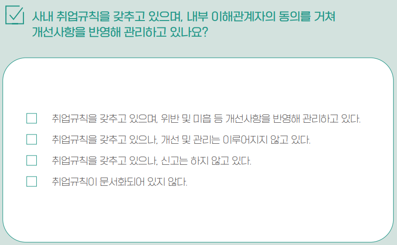 취업규칙 미흡 및 법령 위반에 대한 개선사항을 반영하고 관리해야 합니다. 취업규칙 변경 시에는 근로자의 의견을 반영해야 합니다.