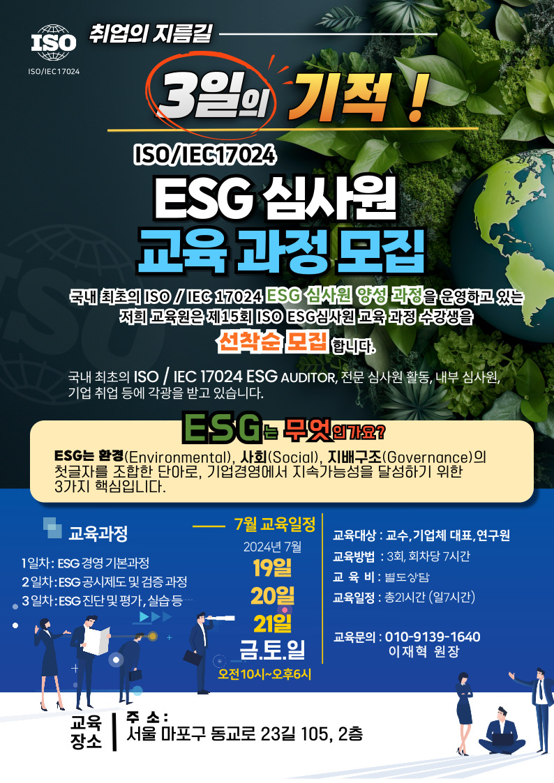 #취준 #취업준비 #ESG #ESG경영 #지속가능보고서 #ISO #ESG심사원 #노후대책 #노후준비 #ESG국제자격증 #ISO19011심사원스킬 #ISO9001심사원 #ISO14001심사원 #ISO45001심사원 #ESG탄소배출관리사