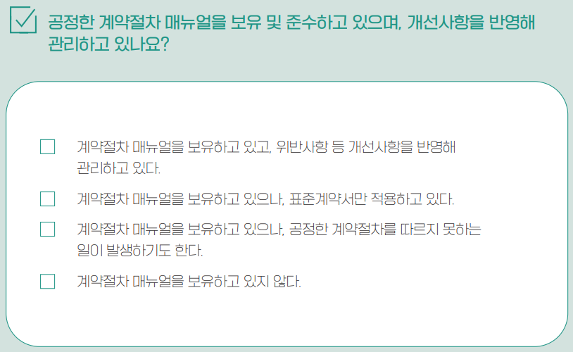 공정거래가 이루어질 수 있도록 절차 및 표준계약서를 문서화합니다. 사업과 관련된 공정거래 준수사항을 담은 표준계약서를 마련합니다.