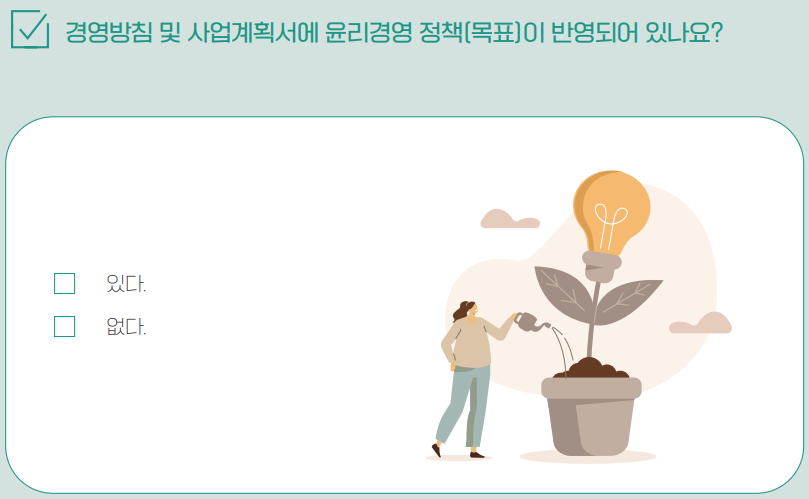 업종과 특성에 맞는 윤리경영 방침과 세부정책을 수립합니다. CEO와 전 직원이 윤리경영의 의미, 필요성을 인지하고 윤리서약서를 작성합니다.