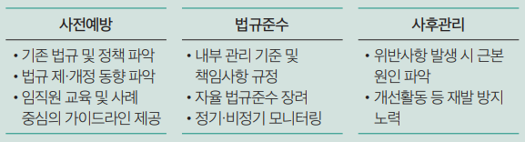 ESG 관련 법규준수 관리에 소홀하여 위반사항이 발생할 경우 처벌 및 제재, 생산성 하락 등 경영상의 직접적인 손해가 발생할 수 있습니다. 기업의 이미지 및 명성에 대한 부정적인 영향으로 간접적인 피해까지 이어질 수 있습니다. 그러므로 환경, 사회, 지배구조와 관련한 법규준수를 위한 관리시스템을 구축해야 합니다.