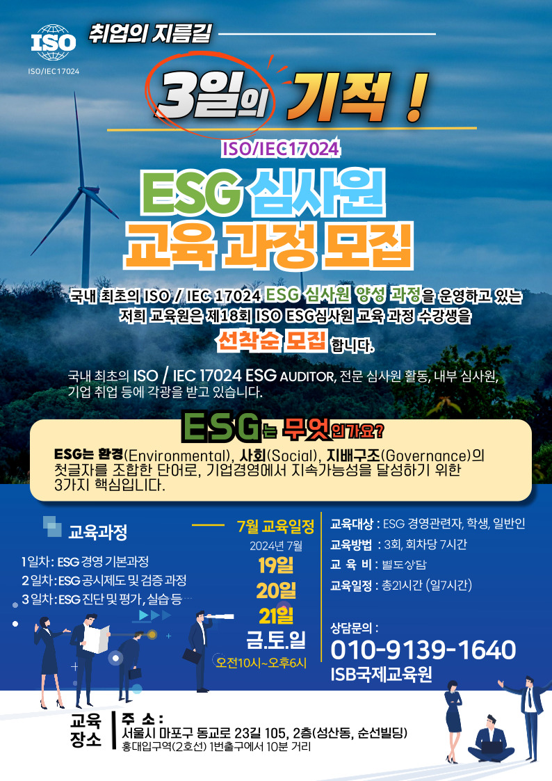 #취준 #취업준비 #ESG #ESG경영 #지속가능보고서 #ISO #ESG심사원 #노후대책 #노후준비 #ESG국제자격증 #ISO19011심사원스킬 #ISO9001심사원 #ISO14001심사원 #ISO45001심사원 #ESG탄소배출관리사
