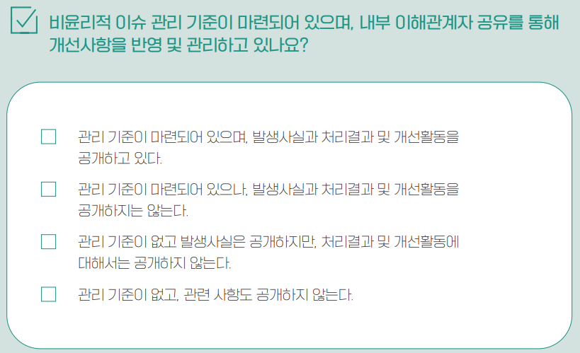 비윤리적 이슈를 지속적으로 관리하고 개선함으로써 전 직원에게 윤리적 행동을 장려할 수 있으며, 기업 내부에 바람직한 기업문화가 정착될 수 있습니다. 기업의 경영 활동 중에 발생할 수 있는 부패, 뇌물수수, 부정청탁 등 비윤리적 이슈 관리 기준을 마련하고 이슈 발생 시 사후조치를 통해 개선하며 그 결과를 공개해야 합니다.