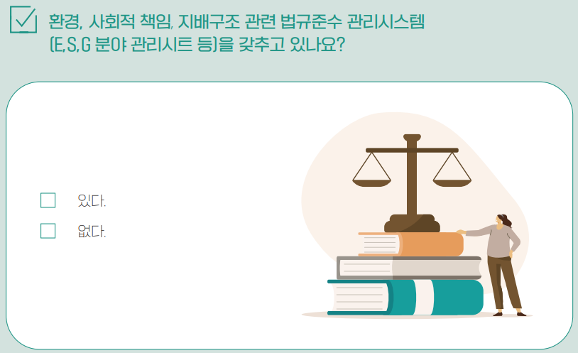 #중소벤처기업 #ESG경영솔루션 #윤리경영 #비윤리적이슈관리 #법규준수 #ESG관련법규파악 #관리시스템구축