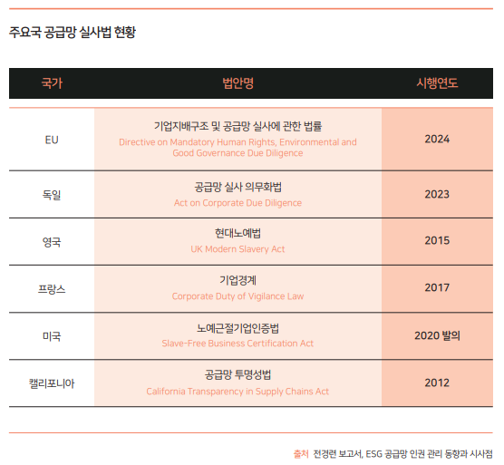 최근 미국과 유럽연합(EU), 독일 등 주요국에서 글로벌 공급망의 인권 현황 실사 의무를 강화하는 규제와 지침을 발표하고 있다. 이에 관련해 국내 기업들의 선제적 대비가 필요하다는 목소리도 나오 고 있다. 공급망 실사법이 시행되면 생산‧ 납품 과정이나 협력업체와의 관계에서 인권 문제가 발생한 기업은 이를 해결해야 한다. 불이행할 경우 벌금, 공공조달사업 참여자격 박탈, 수입금지 등의 제재 를 받게 된다. 영국은 2015년, 프랑스는 2017년에 공급망 실사법을 도입해 시행중이다. 네덜란드는 2022 년, 독일은 2023년에 각각 시행될 예정이다. 공급망 실사법에서 특히 주목할 법은 EU와 독일의 실 사법이다. EU집행위원회는 최근 ‘기업 지배구조 및 공급망 실사에 관한 법률’을 제출했고, 2024년부터 이를 시행하기로 했다. 이 법안에 따르면, EU 회원국에 소재한 기업뿐 아니라 상품과 서비스를 판매 하는 기업까지 해당하므로 현지에 법인을 둔 우리나라 기업들이 영향을 받을 것으로 보인다. 2021 년 7월, EU는 실사법 제정에 앞서 ‘기업 공급망 인권침해 및 강제노동 위험성 평가’ 가이드라인을 발표해 과도기적 성격으로 운용하겠다고 발표했다. 환경 분야에서 시작된 EU발 규제가 큰 영향력 을 미치는 만큼, S 분야 규제인 실사법의 강도가 어느 정도일지 주목받고 있다. 한편, 독일의 공급망 실사법(‘공급망에서의 인권침해 방지를 위한 기업 실사에 관한 법률’)은 2021년 3월 독일 정부의 승인을 받고, 6월 국회를 통과했다. 독일 실사법은 2023년 1월 시행된다. 전국경제인연합(전경련)은 2021년 10월 「ESG 공급망 인권 관리 동향과 시사점」 보고서에서 대 (對) EU 교역 1위 국가인 독일에서 공급망 실사 의무화법이 시행되면 우리나라의 수출 기업인 삼성 SDI, LG화학, SK이노베이션 등 163곳이 법 적용 대상이 된다고 밝혔다. 실사법 적용 대상은 독일에 본사, 주요 지사, 관리 또는 법정 소재지가 위치하며, 해외 파견 직 원을 포함해 독일에서 3,000명 이상을 고용한 기업이다. 2024년에는 대상이 1,000명 이상 고용 기업으로 적용 범위가 확대된다. 메르켈 전 총리를 필두로 한 보수당인 기독교민주연합에서 강력한 기업 규제를 포함한 법이 통과된 것은 10년 정도 이에 대한 논의를 통해 기반이 마련됐기 때문이다. 독일은 2011년 ‘유엔 기업과 인권 이행지침(UNGPs)’을 채택하고 이를 이행하기 위해 ‘기업과 인권을 위한 국가행동계획(National Action Plan, NAP)’을 도입했다. NAP는 자발적으로 공급망 실사를 하도록 유도하지만, 2018년 3월 독일 주요 정당들은 NAP 이행 정도를 조사하고 목표 달성 이 어렵다고 판단, 구속력 있는 법적 규제를 하겠다고 합의했다. 2019년과 2020년에 두 차례 조 사한 결과 NAP 이행률이 낮아서, 자연스럽게 공급망 실사법이 제정되었고, 2021년 6월에 발효됐 다. 독일의 공급망 실사법에 따라 기업은 ▲위험 관리 ▲위험 분석 ▲정책 성명 및 예방 조치 ▲시 정 조치 ▲문서화 및 보고 의무를 갖는다. 평가 대상은 자체 사업영역, 직접 공급업체, 간접 공급업 체로 나눠 이행사항이 다르다. 자체 사업영역은 문제 발생시 즉시 시정하고, 직접 공급업체는 빠르 게 문제를 해결하기 어려우면 최소화 및 방지를 위한 구체적 전략을 수립해야 한다. 간접 공급업체 는 해당 기업이 간접 공급업체의 위반 가능성을 인지한 경우에만 의무를 적용하게 돼 있다.