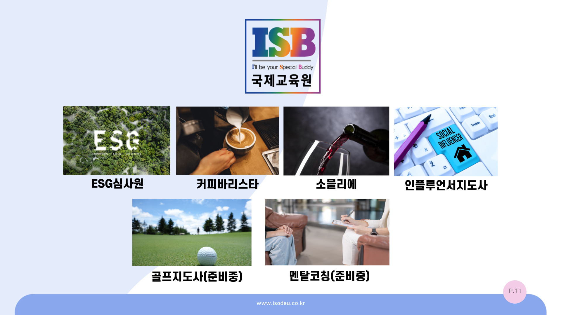 아이에스비(ISB)국제교육원 | 이재혁 | 서울특별시 강남구 테헤란로 1길 28-11, 5102호(역삼동, 조이빌딩) | 사업자 등록번호 : 150-18-01274 | TEL : 010-9139-1640 | Mail : 2097LJH@naver.com | 통신판매신고번호 : 제2023-인천서구-3696호 | 사이버몰의 이용약관 바로가기