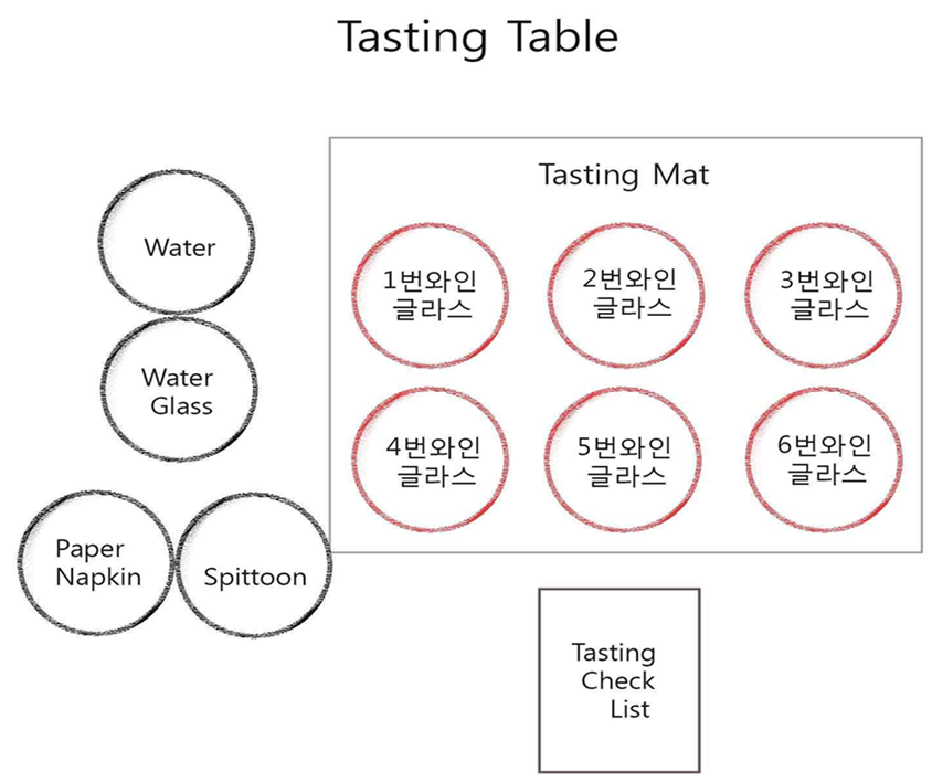 테이블이 흔들리지 않도록 고정시킨 다음, 무늬가 없는 흰색 테이블 클로스를 테이블 위에 반듯이 펼쳐 놓은 다음, 테이블 오른쪽에서 약 10cm 간격을 두고 테이스팅 매트를 올려놓는다. 테이스팅 매트 위에 와인 수량에 맞춰 1번 와인 글라스를 왼쪽부터 오른쪽으로 세팅한다. 테이블 왼쪽에 물과 물잔을 놓고, 접시 위에 종이 내프킨을 올려서 테이블에 놓은 다음, 시음한 와인이나, 물을 마신 후 뱉어 낼 수 있는 타구(Spittoon)를 놓는다. 마지막으로 테이스팅 체크 리스트를 세팅하고, 테이블 의자를 정리하여 테이블 세팅을 마무리한다.