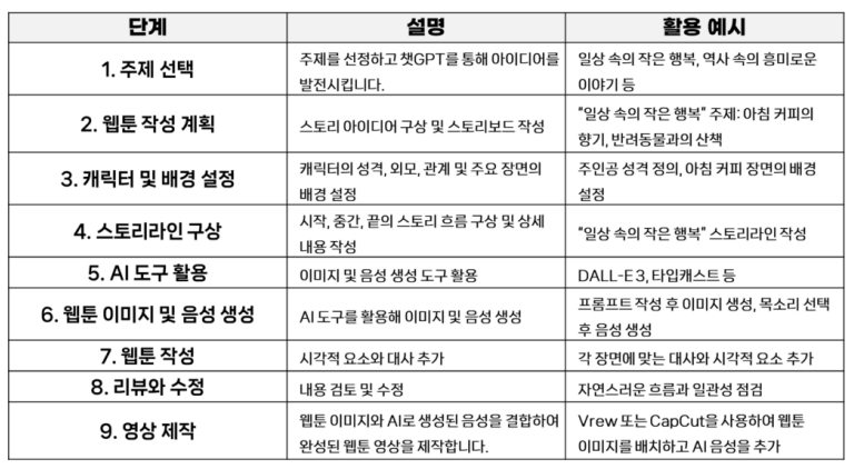 웹툰의 내용을 구체화하기 위해 AI 도구를 활용합니다.