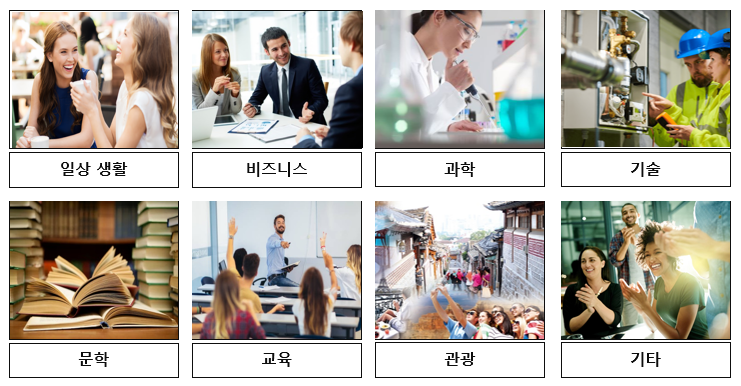 ISO/IEC 17024 한국어는 일상생활회화, 비즈니스 , 과학, 기술, 문학 등 의 영역에서 출제되며,  등급에 따라