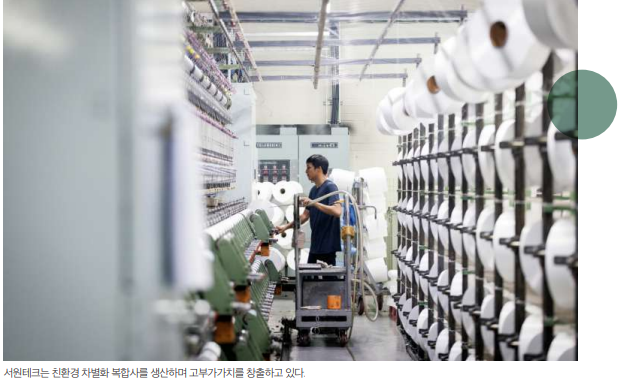 섬유산업에서 ESG 경영을 하려면 친환경 소재 적용과 생산설비의 변화가 필수적이다. 서원테크는 지속적인 공정혁신과 연구개발을 통해 연간 1만t 이상의 친환경 차별화 복합사를 생산하며 고부가가치를 창출하고 있다. ESG 경영을 도입해 세계 최고의 친환경 소재 기업으로 발돋움하려 한다.
