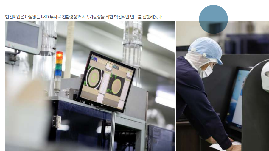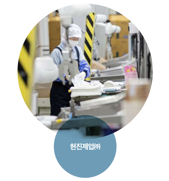 현진제업은 종이컵 성형기계를 국산화한 주인공으로, 1979년 설립 이후 한길만 걸 으며 국내 최대의 식품위생용 종이용기 전문기업으로 성장했다. ‘위생과 품질은 타협하지 않는다’는 신념을 바탕으로 전체 공정에 최신 정밀 이물검사 시스템을 도입해 최고의 안정성과 품질력을 구현해냈다. 독보적인 기술력을 갖춘 현진제업은 종이컵 성형기계 제작부터 인쇄, 코팅, 성형까 지 원스톱 생산체제를 구축했다. 이를 기반으로 식품 포장 패키지에 이르기까지 제 품군을 다변화하고 있다. 특히 종이컵과 종이 식품용기의 친환경성과 지속가능성 을 위해 독자적으로 혁신적인 연구개발을 진행해, 플라스틱 제품의 대체제로서 종 이의 가능성을 업계에 꾸준히 제안하며 환경보호에 앞장서온 것으로도 유명하다.