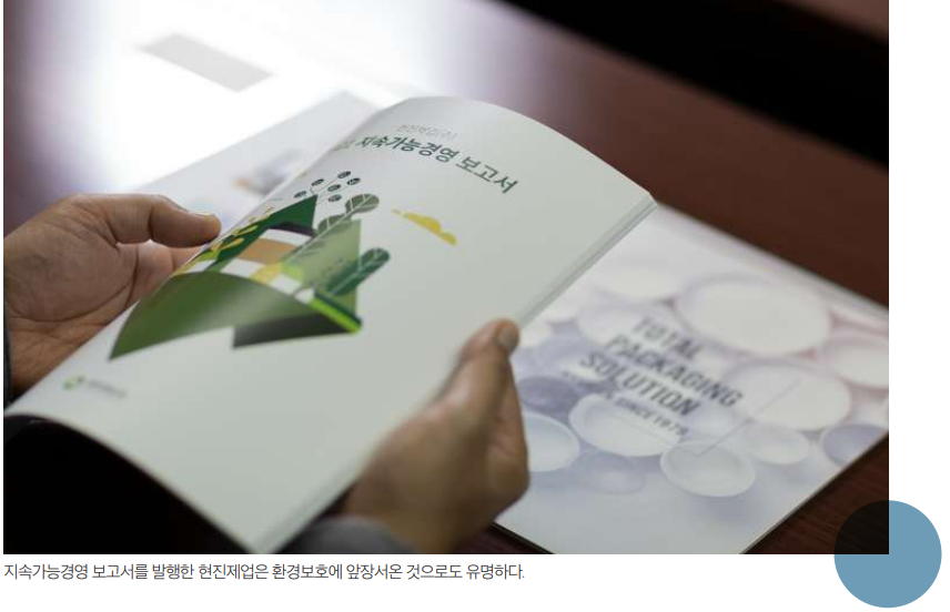 현진제업은 책임경영을 실현하기 위해 구성원의 평등, 인재 유치 및 유지, 산업안 전 및 보건, 인권존중, 협력기업과 공급망의 지속가능성 관리, 사회공헌 활동 등 다 방면으로 세부 정책을 수립하고 이를 실천하는 데 주력했다. 특히 보건과 안전에 관한 유해·위험요인을 지속해서 파악해 산업재해를 예방하고, 리스크 관리를 통해 사고 발생을 원천적으로 봉쇄하거나 최소화해나갔다. 또한 국제표준인 환경경영 시스템 ISO 14001, 품질경영시스템 ISO 9001, 안전보건경영시스템 ISO 45001 인 증을 잇달아 획득하고 이를 지속해서 유지하는 데 최선의 노력을 기울이고 있다. 무엇보다 2014년 산림경영시스템(FSC-CoC) 인증을 획득했다는 점도 주목할 만 하다. FSC는 무분별한 개발로 인한 산림훼손을 막고 지구환경 보존과 지속가능한 발전을 위해 산림인증을 받은 원지로만 제품을 생산한다는 것을 의미하기 때문이 다. 이러한 노력으로 현진제업은 지구환경을 위한 지속가능성을 실천하는 기업으 로 그 위치를 공고히 하고 있다.