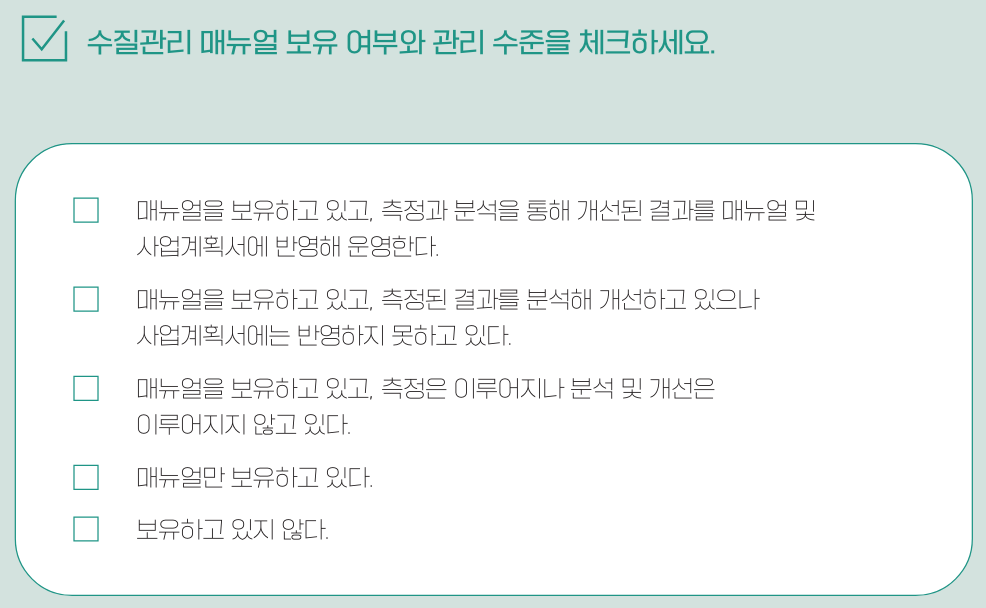 용수 및 폐수 관리 매뉴얼을 개발해 사용량 및 배출량을 지속적으로 관리합니다. 정부 등 외부 기관의 평가 기준이 되는 자료이므로 신중하게 제작해야 합니다.