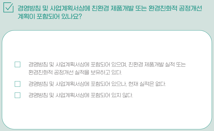 • 제품 환경성 개선 : 친환경 제품개발 활동을 통해 제품 기능은 동일하되 친환경적인 요소를 추가하여 제품의 환경성 개선