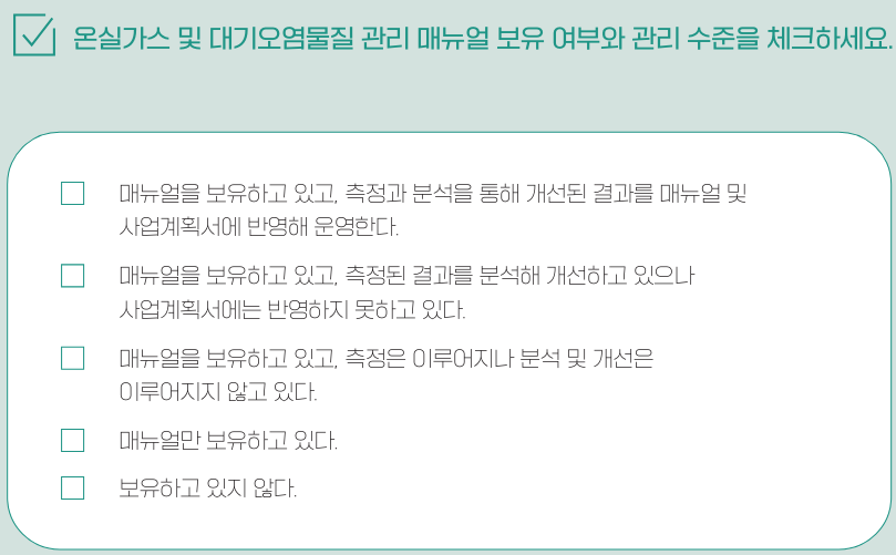 온실가스 관리 매뉴얼을 개발하여 배출량을 지속적으로 관리합니다. 정부 등 외부 기관의 평가 기준이 되는 자료이므로 신중하게 제작합니다.