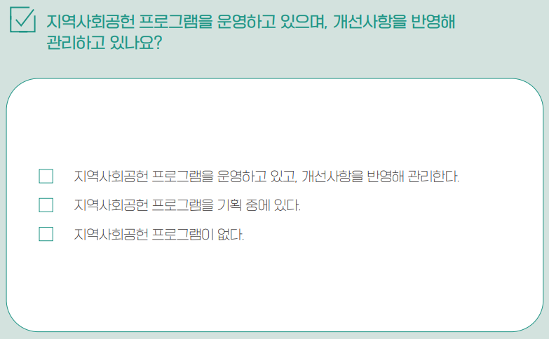 기업과 지역사회 간의 상호작용을 통해 기업이 지역사회의 복지와 발전에 기여할 수 있는 프로그램을 실행해야 합니다. 지역사회의 일원으로서 공헌하는 것뿐만 아니라 지역사회와 원만한 관계를 유지하여 대기오염, 소음공해 등 불가피한 사건이나 사고 발생 시 민원신고 등의 위험을 최소화할 수 있습니다.