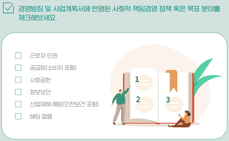 기업의 경영활동에서 발생할 수 있는 인권침해, 산업재해, 공급망 위협 등의 부정적인 영향을 사전에 방지하고, 문제 발생 시 적절한 조치를 취하기 위해 사회적 책임 정책 수립이 필요합니다. 근로자 인권 보호, 사회공헌, 공급망(소비자) 관리, 정보보안, 산업재해 예방 등과 관련된 책임경영 정책 또는 목표를 수립해야 합니다.