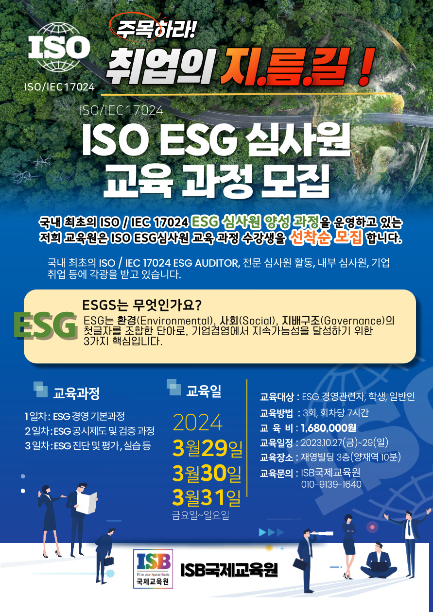 #취준 #취업준비 #ESG #ESG경영 #지속가능보고서 #ISO #ESG심사원 #노후대책 #노후준비 #ESG국제자격증 #ISO19011심사원스킬 #ISO9001심사원 #ISO14001심사원 #ISO45001심사원 #ESG탄소배출관리사