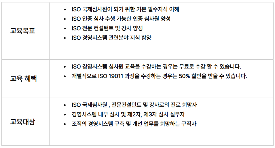 ISO 19011 과정은  심사원 공통교육과정 으로 모든 심사원 과정의 기본이 되는 과정으로  심사원이 전반적으로 갖춰야 하는 태도, 역량, 심사 수행 방법, 심사 프로그램 관리, 심사원 적격성 등을 이해를 증진 시키는 것을 목적으로 하고 있습니다.