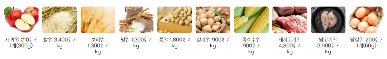 유네스코 산하의 세계적 물·환경교육기관인 국제구조수리환경공학연구소(IHE)에서 발표한 주요 농산물의 물 발자국은 다음과 같습니다.