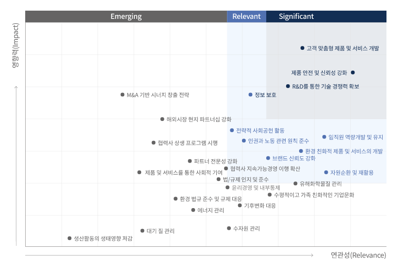 아래의 그림처럼 중요성 평가 결과를 바탕으로 중요성 매트릭스를 도출해냅니다. 이는 현재 기업과 이해관계자들의 관심사와 기업을 둘러싼 주제들의 관련성과 중요도를 시각적으로 한 눈에 파악할 수 있습니다.