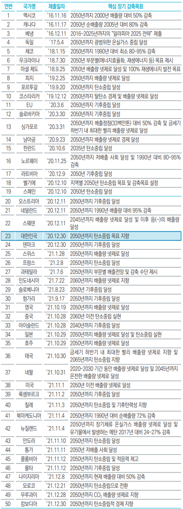 한편 금세기 하반기 전 지구적인 탄소중립 달성을 위해 모든 당사국은 장기 온실가스 저배출 발전전략(LEDS), 일명 ‘장기 저탄소 발전전략’을 수립하여 2020년까지 제출하기로 했다. 저탄소 발전전략은 파리협정의 장기 온도목표 달성을 위해 각 국이 설정한 발전 원칙 또는 비전이라고 할 수 있으며, NDC는 이러한 장기 저탄소 발전전략의 구체적인 중기 이행 계획으로써 역할을 한다. ’22.2월말 기준 우리나라를 포함한 50개국이 LEDS를 제출하였고, 이 중 39개국이 탄소중립 목표를 장기 비전으로 설정하였다.