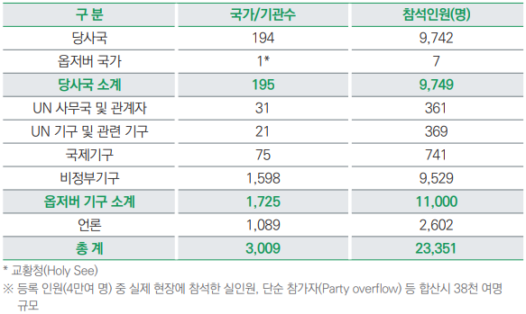 ● (개최 규모) 194개 기후변화협약 당사국 및 국제기구, 시민사회, 언론 등 23천여명