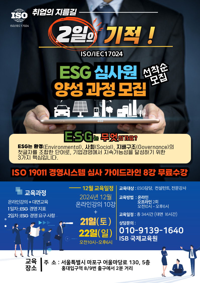 #취준 #취준생 #취업준비 #ESG경영 #ESG평가 #노후대책 #노후준비 #새로운발견 #ESG #지속가능보고서 #ISO #ESG심사원 #탄소중립 #탄소발자국 #탄소세 #ISO19011 #ISO9001 #ISO14001 #ISO45001 #ESG탄소배출평가사 #ISO심사원