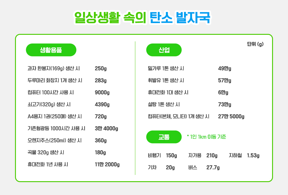 ☞ 탄소발자국 (Carbon Footprint) : 개인 또는 기업등이 직·간접적으로 발행시키는 온실가스, 특히 탄소의 총량을 의미한다. 제품생산시 발생한 이산화탄소의 총량을 탄소발자국으로 표시하게 하는 것으로, 표시 단위는 무게 단위인 kg 또는 우리가 심어야 하는 나무수로 나타낸다. 일상생활 및 제품 생산에서 사용하는 연료, 전기, 폐기물 등이 모두 포함된다.