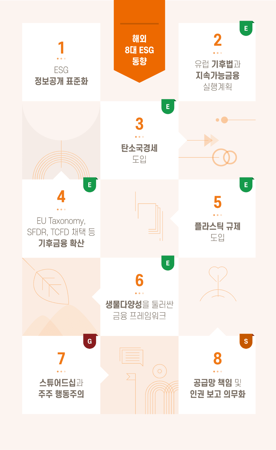 EU 택소노미, 일명 녹색분류체계는 친환경과 지속가능성을 판별하는 기준이다. 2020년 3월 최종 보고서가 나왔으며, 기후변화 리스크 완화 기후변화 리스크 적응 수자원 및 해양생태계 보호 자원순환 경제로 전환 오염물질 방지 및 관리 생물다양성 및 생태계 복원 등 6대 부문이 녹색으로 인정된다. 택소노미는 2022년 1월부터 공식 적용되는데, 비재무정보공개지침(NFRD, Non-financial Reporting Directive)에 따라 ESG 정보를 공개해야 하는 기업은 향후 택소노미에 따른 활동 및 성과 정보를 공개해야 한다. 또 모든 투자자와 금융기관도 택소노미가 적용된 투자 및 금융자산 비중을 공개해야 한다.