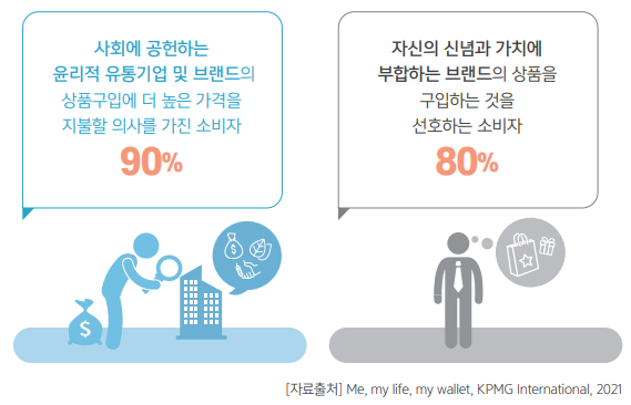 ESG 경영체계로의 전환은 중소·중견기업들의 생존과 경쟁력 확보를 위한 필 수 요소가 되었다. ESG 경영의 필요성은 무엇보다 고객과 소비자의 인식 변화 에서 찾을 수 있다. 최근 소비 트렌드와 소비자 인식은 ESG 핵심요소를 갖춘 기업과 브랜드에 주 목하기 시작하였고, 이는 실제 구매의사결정에도 영향을 주고 있다. B2B고객 또한 기존에는 제품 생산과 판매에 중점을 두었다면, 이제는 전체적인 밸류체 인에 대한 관심이 높아지면서 ESG에 대한 기업의 책임과 요구가 커지고 있다.