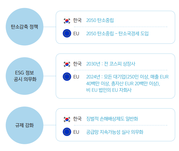 한국, EU, 미국 등을 중심으로 한 각국에서는 2050년까지 탄소중립 달성을 위 한 관련 정책과 규제가 이루어지고 있다. 특히 탄소와 폐기물 등의 환경영향을 비롯하여 기업의 환경 및 사회적 책임에 대한 요구가 강화되고 있다.