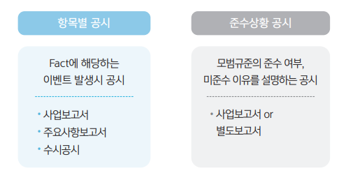 ESG 공시는 항목별 공시와 준수상황 공시의 2가지 방법이 병존한다. 항목 별 공시는 전통적인 의무공시의 한 방법이고, 준수상황 공시는 영국에서 시 작된 원칙 중심 공시의 대표적인 사례라고 할 수 있다.