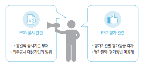 ESG 공시 및 평가와 관련해서는 아직 통일된 기준이 마련되지 않아 여러 쟁 점들에 대한 논의가 지속되고 있다. 우리나라도 ESG공시가 점점 규제화되 면서 유사한 논의가 발생할 것으로 예상된다.